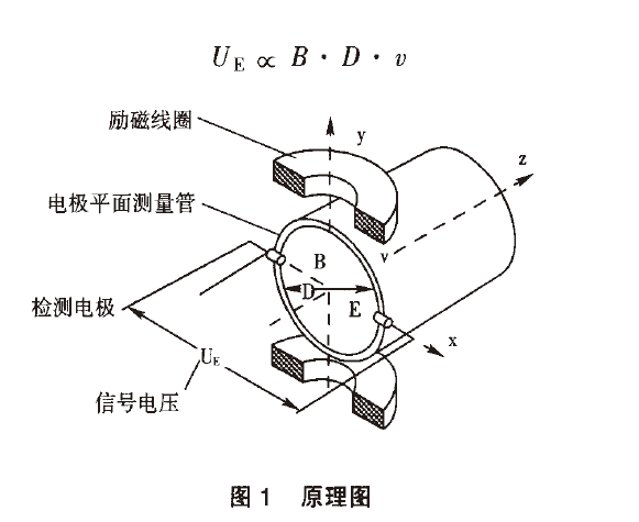 產(chǎn)生與流量成比例的感應(yīng)電勢(shì),流體中產(chǎn)生的感應(yīng)電動(dòng)勢(shì)被位于管子徑向兩端的一對(duì)電極拾取,該信號(hào)電壓uE與磁場(chǎng)強(qiáng)度B、電極間距離D和平均流速穢成正比。磁場(chǎng)強(qiáng)度B和電極距離D是常數(shù),所以信號(hào)電壓與平均流速口成正比。計(jì)算公式如下: