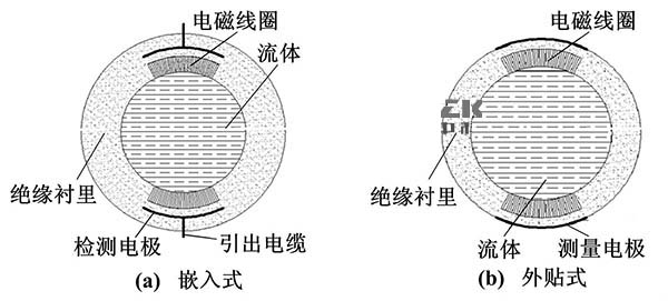 電極與被測流體通過絕緣管形成檢測電容,通過此電容來藕合流量信號。其主要的結(jié)構(gòu)形式按照電極的安裝位置可以分為兩種:電極嵌人測量管的絕緣襯里內(nèi)部(嵌人式)、電極貼在測量管外部(外貼式)。嵌入式結(jié)構(gòu)與普通冷卻塔冷卻水流量計結(jié)構(gòu)相似,而外貼式大多是通過陶瓷表面金屬化技術(shù)將電極貼在測量管外。