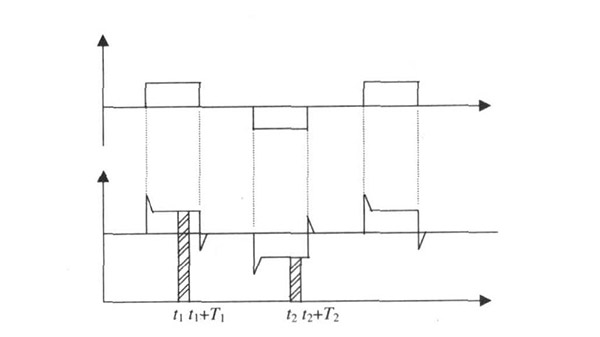 給水廠原水電磁流量計一般都采用工頻交流電源供電, 其電源電壓的幅值和頻率的變化都會給給水廠原水電磁流量計帶來電源性干擾噪聲。對電源電壓的幅值變化, 因采用多級集成穩(wěn)壓, 一般而言電源電壓的幅值變化對電磁流量的測量精度影響不大。當電源電壓的頻率波動時, 雖然其波動范圍有限, 但對給水廠原水電磁流量計測量精度影響較大。為了解決工頻干擾問題, 實現(xiàn)對流體流速感應電勢eab信號的準確測量, 需利用以下基本關系:①勵磁周期為工頻周期的整數(shù)倍, 即勵磁頻率為50/nHz(n為偶數(shù));②正負勵磁下的同相位采樣。圖2是對應低頻矩形波勵磁形式下的典型電勢信號形式, 按上述關系在一個勵磁周期下, 若假設t1 和t2 點為工頻干擾的等效干擾點, 且采樣寬度T=T1 =T2 , 則eab的基本算式為: