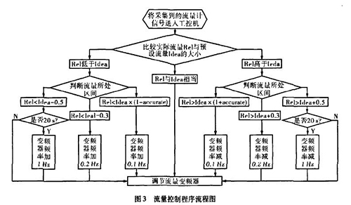 實際生產(chǎn)中流量一直在某個區(qū)域內(nèi)波動,且其動態(tài)特性不易掌握。從上面的理論中我們能夠讓誤差△£盡可能的小,這樣距我們所需要的理論值%就越接近。而減小誤差需要我們把n取的盡可能大,也就是在生產(chǎn)時間內(nèi)劃分更多的周期去調(diào)節(jié)流量。當(dāng)工控機根據(jù)稀硝酸專用流量計傳送回來的信號發(fā)出調(diào)節(jié)變頻器工作頻率的指令后,電機調(diào)整功率到稀硝酸專用流量計的實際測量為一個工作周期,我們知道從指令發(fā)送到實際測量值返回有一個較大的滯后,如果調(diào)節(jié)的周期時間小于流量計本身的一個工作周期,那么顯然不可能達到減小誤差的目的。利用模糊控制思想H。,在控制程序中我們把流量的波動區(qū)域劃分為±缸×Yo,Yo-t-O.3,Yo±0.5四個區(qū)域,其中缸為可調(diào)節(jié)的誤差范圍,生產(chǎn)中我們?nèi)?.015,流量區(qū)域劃分的單位均為t/h。針對不同的區(qū)域采取不同的調(diào)整方案。具體流程如圖3所示。圖中變量Rel表示實際測量的流量,變量Idea表示理論流量。