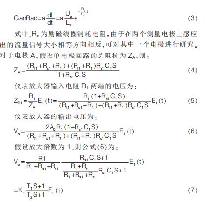 提出在硬件電路上加入模擬開關(guān), 干擾尖峰到來時斷開模擬開關(guān)避免干擾進(jìn)入后級電路,尖峰過去重新打開模擬開關(guān);K.Saito 等提出漂移校正法,先以高勵磁頻率進(jìn)行勵磁,在勵磁過程中插入低勵磁頻率提取用于漂移校正的非固定微分噪聲分量,但在插入的低勵磁頻率段漿液噪聲較大且很難將漿液噪聲與流量信號分離,此時的校正因子非單純的非固定噪聲分量,改進(jìn)措施是長時間取平均值得到穩(wěn)定因子。 傳統(tǒng)方法是同步采樣保持法,即在磁場穩(wěn)定階段采樣。 其他消除干擾的方法有設(shè)置干擾補(bǔ)償機(jī)構(gòu)、控制勵磁電流變化率減小干擾幅值、矩形波代替梯形波、希爾伯特黃變換結(jié)合傅里葉變換和程控增益技術(shù)等。經(jīng)上述對現(xiàn)有的文獻(xiàn)分析與總結(jié)可知, 當(dāng)前消除微分噪聲主要從信號處理方面入手,并未對影響噪聲的因素加以研究。 本文建立電極測量回路等效模型,給出仿真模型搭建、參數(shù)取值和仿真結(jié)果分析。
