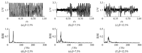 試驗(yàn)發(fā)現(xiàn),氣相的加入對過熱蒸汽流量計(jì)測量的影響顯著,譜分析和脈沖計(jì)數(shù)兩種方法隨著氣相注入的增加其表現(xiàn)也不同。圖4反映了水流量12m3/h時(shí),注入不同氣含率β時(shí)A點(diǎn)的模擬信號,如圖4(a~c)所示;經(jīng)譜分析后得到的頻率值,如圖4(d~f)所示;用脈沖計(jì)數(shù)方法得到的脈沖信號,如圖4(g~i)所示。圖4顯示,當(dāng)注入氣量不大時(shí),對過熱蒸汽流量計(jì)的影響不大,無論是譜分析結(jié)果還是脈沖計(jì)數(shù)得到的結(jié)果都比較好。當(dāng)注入的氣量進(jìn)一步增加時(shí),渦街原始信號強(qiáng)度和穩(wěn)定性逐漸變差,渦街頻率信號會被干擾信號所淹沒,反映到譜分析圖是,渦街頻率的譜能量減小,干擾信號的譜能量加強(qiáng);對于脈沖信號,會因?yàn)橐恍┬郎u信號減弱,形成脈沖缺失現(xiàn)象,而不能真實(shí)地反映渦街產(chǎn)生的頻率。