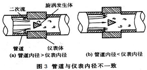 而丙烷流量計(jì)與安裝管道內(nèi)徑也會存在誤差,或大或小,如圖3所示,當(dāng)被測介質(zhì)經(jīng)過時(shí),也會發(fā)生二次流動,對測量結(jié)果產(chǎn)生波動影響。