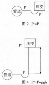 建議采用圖2的安裝方式,如不得已需要選擇圖3、圖4的安裝方式一定要對壓力進(jìn)行補償。不建議按照圖5的方式安裝,因為無法確定P'與P的關(guān)系。