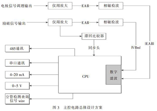 電極檢測出的微弱感應電動勢E, 先經前置放大器的放大和噪聲抑制而成為大幅度低阻抗的電壓信號。此信號經相敏檢波后,給CPU 進行數字濾波、處理和控制,通過利用雙線性變換法將模擬的二階巴特沃斯低通濾波器轉換為數字式濾波器,既簡化電路設計,且可靠性高、穩(wěn)定性好。通過編寫軟件CPU 能對放大器的溫度漂移及零點漂移給予補償, 并在測量的全量程范圍內分10 段對信號進行非線性修正,使得測量值更好地擬合真實數據??展軝z測電路上,CPU 作為從控制器。當主控制電路上發(fā)出空管檢測查詢信號wire, 從控制器進行識別后接收并判斷出查詢什么信號,然后產生應答信號上傳至主控芯片輸出顯示;當檢測為空管信號時, 從CPU 發(fā)出的zero 信號通過控制MOS 管開關來關斷流速輸出。在應用中,對于微弱信號的放大及提取還需注意PCB 板設計時EMI 電磁屏蔽考慮,屏蔽來自空間磁場的干擾、周邊設備的輻射造成的干擾和板內之間的干擾,如數模分離、強弱電分離等等。