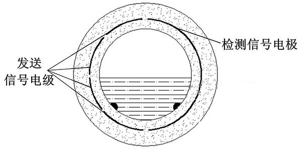 ③利用阻抗或信號(hào)衰減研制的非滿管管道式電磁流量計(jì)。這種結(jié)構(gòu)的非滿管管道式電磁流量計(jì)是當(dāng)前國(guó)內(nèi)研究的方向之一。其結(jié)構(gòu)是流量管底部貼一對(duì)信號(hào)發(fā)射電極,在流量管中間貼信號(hào)接收電極。由于信號(hào)在流體中傳播會(huì)產(chǎn)生衰減,且傳播時(shí)間越長(zhǎng),衰減越多,因此通過信號(hào)接收電極接收到的信號(hào)衰減量即可得知液面高度;同時(shí)該電極還能測(cè)量流體切割磁感線產(chǎn)生的電動(dòng)勢(shì),以此達(dá)到測(cè)量非滿管流量的目的。阻抗式或信號(hào)衰減非滿管管道式電磁流量計(jì)結(jié)構(gòu)簡(jiǎn)圖如圖5所示。