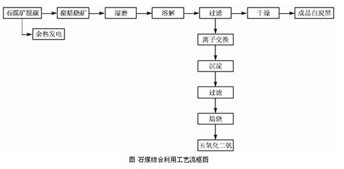 本項(xiàng)目為石煤綜合利用的項(xiàng)目。現(xiàn)有提釩工藝產(chǎn)生大量廢渣。其主要成分為二氧化硅,但其中夾帶有大量的釩資源,釩資源利用率低,同時(shí),該廢渣中堿含量較高,如將廢渣隨意堆放,易造成環(huán)境污染。本項(xiàng)目*大特點(diǎn)在于利用現(xiàn)有提釩工藝中的提釩二次渣作為制備沉淀法白炭黑的主要原料,將廢渣中的硅資源得到充分利用。為企業(yè)創(chuàng)造了新的經(jīng)濟(jì)增長點(diǎn),同時(shí),解決了現(xiàn)有提釩生產(chǎn)中造成的釩資源浪費(fèi)和環(huán)境污染問題,此外,該項(xiàng)目利用現(xiàn)有提釩生產(chǎn)線脫碳工序中產(chǎn)生的余熱作為加熱熱源,取代了傳統(tǒng)工藝以煙煤為主要燃料的方法,即對生產(chǎn)中產(chǎn)生的余熱得到了有效合理的利用,又進(jìn)一步降低了產(chǎn)生的燃料成本,達(dá)到了節(jié)能減排,資源綜合利用的目的,工藝流程框圖如下。