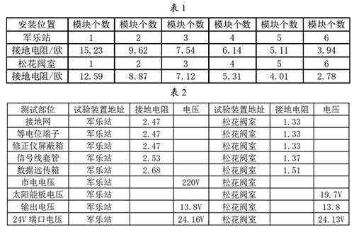 接地網(wǎng)的安裝與連接:接地網(wǎng)是整個色拉油流量計防雷試驗(yàn)比較關(guān)鍵的一個內(nèi)容,能不能準(zhǔn)確的論證試驗(yàn)的有效性,必須保證接地網(wǎng)達(dá)到標(biāo)準(zhǔn)的接地電阻,通過對實(shí)地地電阻率的測試,初步選擇6個接地模塊埋設(shè)并配用降阻劑使用,邊安裝邊測試直到達(dá)到標(biāo)準(zhǔn)值后才引入等電位箱。在軍樂站和松花閥室安裝模塊并測試數(shù)據(jù)見表1。