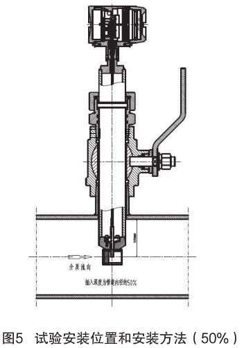 對插入式煙氣流量計和插入式電磁流量計的結(jié)構(gòu)原理進行分析,插入式電磁流量計的信號采集點在標(biāo)校管道內(nèi)12.5% 為宜,因它屬電磁類流量計,而煙氣流量計是根據(jù)“卡門渦街”原理進行測量管道內(nèi)流量,根據(jù)標(biāo)校管道內(nèi)層流和湍流的分析,以及插入式煙氣流量計獨特的探頭結(jié)構(gòu)形式,確定插入式煙氣流量計的插入深度為標(biāo)校管道內(nèi) 50%,試驗安裝位置和安裝方法如圖 5 所示。