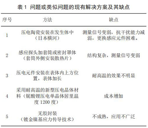3) 當(dāng)前技術(shù)系統(tǒng)存在的問題。 由于目前使用的傳感器檢測感應(yīng)元件為壓電陶瓷,其極化時居里溫度大約420 ~ 460℃,因此只能在低于 240℃介質(zhì)中使用,一旦被測量介質(zhì)的溫度高于 240℃,二氧化硫流量計傳感器便會因壓電陶瓷達到居里點,絕緣電阻降低,壓電信號變?nèi)醵А?br /> 4)問題或類似問題的現(xiàn)有解決方案及其缺點(見表 1)。