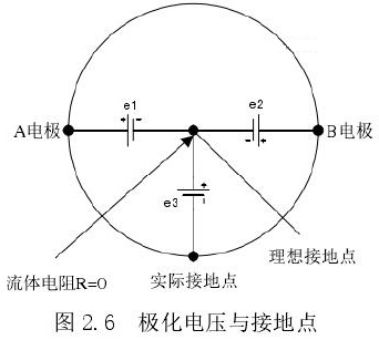 直流干擾主要來源于濃硫酸流量計工作時出現(xiàn)的電化學(xué)噪聲。當電解質(zhì)和接液部件一旦接觸,電解質(zhì)中的正負離子將會即刻出現(xiàn)定向運動,即使沒有通電,電解質(zhì)中的正負離子會產(chǎn)生一個定向運動,此時在電解液中會形成一個明顯的電位差,出現(xiàn)的此種現(xiàn)象被稱為極化現(xiàn)象??蓮膱D 2.6 中進行觀察,兩個電極若是產(chǎn)生了大小相等,方向相反的電位e1=e 2時,兩個電極之間的電位差可視為零;當兩個電極之間的電位呈現(xiàn)出e1 ≠e2 的關(guān)系時則表示兩個電位之間存在一個明顯的電位差,產(chǎn)生的電位差之間則會出現(xiàn)相應(yīng)的電流從而形成極化電壓。此電壓與共模電壓3e 將會共同被轉(zhuǎn)換器前的放大器攝取,此時極有可能會出現(xiàn)放大器無法工作的情況,此種情況主要是由于極化電壓過大所導(dǎo)致,當極化電壓較大時將會把放大器的輸入端堵塞,此時放大器無法正常工作。為了能有效的避免發(fā)生此種情況需要控制降低在電磁場中所產(chǎn)生的極化電壓。