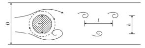 智能渦街流量計是由漩渦發(fā)生體、頻率檢測器和信號轉(zhuǎn)換器等環(huán)節(jié)組成,輸出 4 ~ 20 mADC 信號或脈沖電壓信號。其測量原理是在流動的流體中的垂直流動方向安放 1 根或多根非流體型阻流體,在一定的流量范圍內(nèi),流體在阻流體兩側(cè)交替地分離、釋放出 2 串頻率正比于管道內(nèi)的平均流速、規(guī)則的、不對稱有規(guī)律的交替漩渦列,如圖 1 所示,且兩側(cè)漩渦旋轉(zhuǎn)方向相反 。采用檢測元件測出漩渦頻率就可以推算出流體的流量。