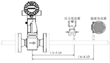 智能渦街流量計的口徑如果與工藝管道相同,不能滿足流量儀表要求時,或者在此流速下測量準(zhǔn)確度不能保證時,需要縮小儀表口徑,從而提高管內(nèi)流速,保證測量精度。上下游必須有足夠的直管段,若傳感器安裝點的上游在同一平面上有 2 個 90°彎頭時,上游直管段≥25D,下游直管段≥5D。根據(jù)測量的需要,需在智能渦街流量計附近測量壓力和溫度時,測壓點應(yīng)在傳感器下游的(3 ~5)D 處,測溫點應(yīng)在傳感器下游的(6 ~8)D 處,如圖 3 所示。