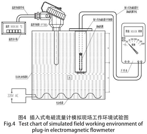 試驗方法:*先,把電磁流量計和溫度傳感器按照圖中所示固定在自動加熱箱體中;其次,把電磁流量計的勵磁線圈的引線(聚四氟乙烯屏蔽線)與萬用表測量阻值端鈕相連接,并把檔位定格在 200Ω 刻度線上;同時把溫度傳感器(PT100 鉑電阻)的引線與溫度顯示器相連接。