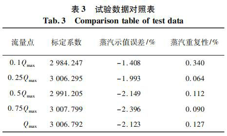 測試對象為同一臺表,DN80 口徑,帶有在空氣標(biāo)定裝置上的 5 點標(biāo)定系數(shù)。將管道介質(zhì)設(shè)定為過熱蒸汽,并預(yù)設(shè)溫度為 160 ℃ 和壓力 0. 4 MPa,以便儀表計算過熱蒸汽的密度。試驗數(shù)據(jù)對照如表 3 所示。