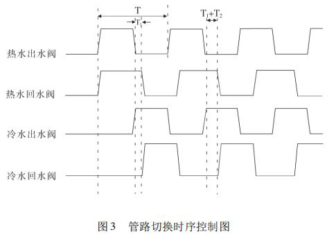 開始試驗(yàn),冷熱水箱預(yù)先達(dá)到試驗(yàn)要求溫度,水泵運(yùn)轉(zhuǎn)調(diào)節(jié)管路流量至設(shè)定值。系統(tǒng)給定信號(hào)控制四個(gè)開關(guān)閥(熱水出水閥、熱水回水閥、冷水出水閥、冷水回水閥) 的打開與關(guān)閉,實(shí)現(xiàn)冷熱水的切換。熱水沖擊時(shí),熱水出水閥與熱水回水閥打開的同時(shí),冷水出水閥與冷水回水閥關(guān)閉,確保試驗(yàn)管路熱水沖擊;同理,冷水沖擊時(shí),冷水出水閥與冷水回水閥打開,熱水出水閥與熱水回水閥關(guān)閉,確保試驗(yàn)管路冷水沖擊。系統(tǒng)通過四個(gè)開關(guān)閥對(duì)管路進(jìn)行時(shí)序控制,達(dá)到管路切換的目的,很好地實(shí)現(xiàn)了 4000次冷熱循環(huán)沖擊試驗(yàn)。其具體的管路切換控制時(shí)序圖如圖 3 所示。