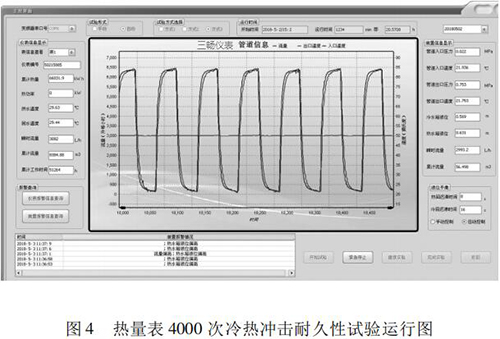 本文研究的 4000 次冷熱沖擊試驗(yàn)的實(shí)現(xiàn)具有以下特點(diǎn): (1)基于“工控機(jī) +水泵 + 煤油流量計(jì)”的閉環(huán)控制系統(tǒng),實(shí)現(xiàn)了流量自動(dòng)反饋調(diào)節(jié),滿足試驗(yàn)要求; (2)通過四個(gè)開關(guān)閥的時(shí)序切換,自動(dòng)控制試驗(yàn)溫度,很好的完成了 4000 次溫度沖擊試驗(yàn); (3)通過“工控機(jī) + 數(shù)據(jù)數(shù)據(jù)采集卡”的數(shù)據(jù)采集系統(tǒng),實(shí)時(shí)監(jiān)控試驗(yàn)過程中的流量、溫度、壓力等相關(guān)參數(shù),實(shí)現(xiàn)試驗(yàn)方式的自動(dòng)控制,并能對(duì)試驗(yàn)數(shù)據(jù)進(jìn)行分析與評(píng)定。 (4)試驗(yàn)的全過程為智能自動(dòng)化,可無人員留守看護(hù)。試驗(yàn)結(jié)果可直接反映出熱量表在長(zhǎng)時(shí)間運(yùn)行后的可靠性。為我國(guó)熱量表耐久性試驗(yàn)研究提供檢測(cè)手段,為促進(jìn)產(chǎn)品質(zhì)量提升做好技術(shù)保障。