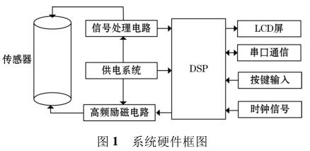 高頻勵磁煤焦油流量計由傳感器、高頻勵磁電路、信號處理電路等組成,其中高頻勵磁電路決定著傳感器磁場的強弱,勵磁電路的穩(wěn)定性以及精確性決定著系統(tǒng)檢測的準(zhǔn)確性以及穩(wěn)定性。DSP 系統(tǒng)控制勵磁電路激勵傳感器線圈,當(dāng)線圈中有導(dǎo)電液體流過時,其切割磁感線并在傳感器兩端的線圈上產(chǎn)生感應(yīng)電動勢,利用信號檢測電路監(jiān)測感應(yīng)電動勢的大小,*后根據(jù)相應(yīng)關(guān)系計算出液體的流量,系統(tǒng)硬件框圖如圖 1 所示。