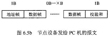 測水流量計等節(jié)點設(shè)備和C機通信的過程中,由地址幀、命令幀、數(shù)據(jù)幀、校驗和可組成各種功能不同的報文。由于采用主從工作方式來實現(xiàn)通信,測水流量計等節(jié)點設(shè)備僅能接收并執(zhí)行PC機發(fā)送來的控制命令,而不能發(fā)送命令給PC機。因此,由PC機發(fā)往流量計等節(jié)點設(shè)備的報文一般包括一個地址幀,一個命令幀,若干個數(shù)據(jù)幀和一個校驗和,其報文格式圖.6a5所示;而由流量計等節(jié)點設(shè)備發(fā)往PC機的報文一般包括一個地址幀,若干個數(shù)據(jù)幀和一個校驗和,其報文格式如圖6.5b所示。