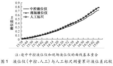 由圖 1 可知,人工標(biāo)尺測(cè)得的液位差值與現(xiàn)場(chǎng)液位儀基本吻合,其變化一致,但中控液位儀顯示的數(shù)據(jù)呈現(xiàn)一定的滯后性,這同信號(hào)的傳輸距離與解析方式相關(guān)。在日后的測(cè)量過(guò)程中,對(duì)于吸水井和清水池這些對(duì)測(cè)量結(jié)果影響較大的地方,需進(jìn)行人工標(biāo)尺讀數(shù),或?qū)x表校驗(yàn)后進(jìn)行現(xiàn)場(chǎng)讀數(shù)記錄。