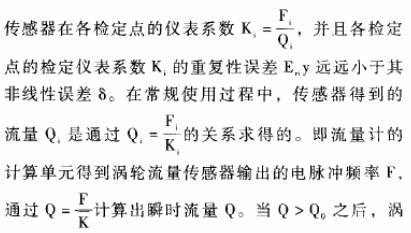 對(duì)于重復(fù)性很好而線性度較差的渦輪流量傳感器,要擴(kuò)大其測(cè)量范圍或減小測(cè)量誤差,研究的核心問(wèn)題是設(shè)計(jì)一-種便捷的使用方法,按照行鑒定規(guī)程利用原有檢定數(shù)據(jù),使渦輪流量傳感器在具有很小重復(fù)性誤差的流量范圍內(nèi),都能得到很準(zhǔn)確測(cè)量效果。