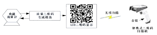 二維碼生成模塊定時向高壓電磁流量計發(fā)送采集指令,后者收到指令后發(fā)送流量數(shù)據(jù)。