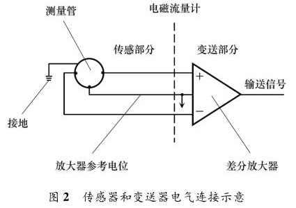 液體流量計主要由兩部分組成:流量傳感器和信號變送器,如圖 2 所示。傳感器上的勵磁線圈接受變送器傳輸來的勵磁電流產(chǎn)生磁場,輸出感應(yīng)電動勢信號;信號變送器則將感應(yīng)電動勢信號轉(zhuǎn)換為流量信號或模擬量信號送至控制系統(tǒng)。液體流量計按組成方式分為一體式和分體式。液體流量計穩(wěn)定工作另外一個重要條件是接地。當(dāng)流體流動穿過磁場時,以導(dǎo)電流體本身作為參考電位,在測量管一側(cè)電極產(chǎn)生正電勢,另一側(cè)產(chǎn)生負(fù)電勢,形成電勢差。但此電動勢信號一般只有幾毫伏,易受外界干擾。為防止干擾,將參考電位接入大地作為零電位,保證傳感器輸出精確穩(wěn)定的信號。傳感器和轉(zhuǎn)換器的接地端必須與被測介質(zhì)同電位,才能構(gòu)成對稱的輸入輸出回路。