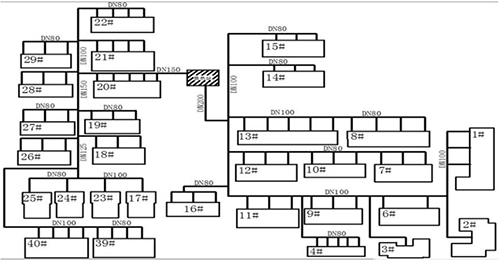 某小區(qū)住宅樓建設(shè)于1996年,建筑結(jié)構(gòu)為磚混建筑,建筑面積為54931m2,共30棟住宅樓。2017年繳費(fèi)739戶,總采暖面積為47141m2。換熱站位于小區(qū)中部,板式換熱機(jī)組設(shè)計(jì)換熱面積為50000m2,循環(huán)泵額定功率為30kW,流量為200m³/h,揚(yáng)程為32m。庭院管網(wǎng)共分為2個支狀供回水環(huán)路,該小區(qū)供熱管網(wǎng)見圖1所示。