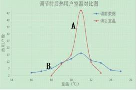 圖3中的曲線 A和B供熱管網(wǎng)智能蒸汽流量計(jì)調(diào)節(jié)前后的熱用戶室溫變化情況,橫坐標(biāo)表示室溫分布,縱坐標(biāo)表示熱用戶數(shù)量。從圖中可以看出,智能蒸汽流量計(jì)調(diào)節(jié)前熱用戶室溫比較分散,既有室溫小于18℃的熱用戶,也有室溫大于24℃的熱用戶。熱用戶室溫“近熱遠(yuǎn)冷”,供熱管網(wǎng)存在水力不平衡現(xiàn)象。智能蒸汽流量計(jì)調(diào)節(jié)后,有49戶用戶室溫在20℃~21℃之間,從圖中可以看出室溫分布范圍縮小,平均室溫降低,從而,不僅減少了供熱量,也大大提高了供熱品質(zhì)。一般來講,對采暖系統(tǒng),每增加 1℃平均室溫,能耗增多 5%~10%。采暖系統(tǒng)實(shí)現(xiàn)平衡后,常??梢越档推骄覝?℃~3℃。