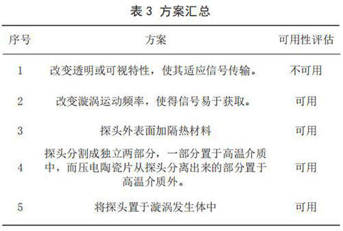 3)查找沖突矩陣,得到如下發(fā)明原理:No.32 改變顏色、No.19 周期性作用、No.24 中介物。方案一:依據No.32 改變顏色發(fā)明原理,得到解如下:改變透明或可視特性,使其適應信號傳輸。方案二:依據 No.19 周期性作用,得到解如下:改變漩渦運動頻率,使得信號易于獲取。方案三:依據 No.24中介物,得到解如下:探頭外表面加真空絕熱材料。