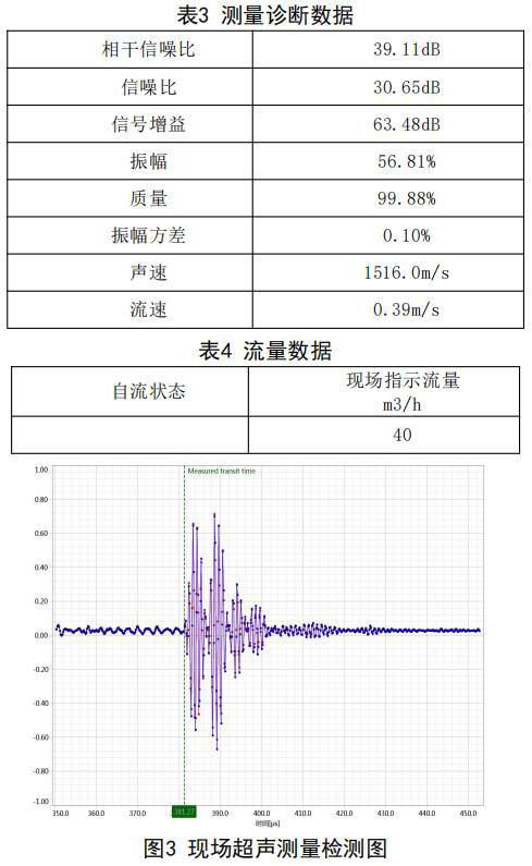在高負(fù)荷段采用泵送補(bǔ)給水狀態(tài):測(cè)試時(shí)間 2018年10月11日,采用德國FLUEX高精度外夾式超 聲波流量計(jì)作為標(biāo)準(zhǔn)流量計(jì),測(cè)量基礎(chǔ)數(shù)據(jù):管道 外徑276.93mm,管壁厚度12.40mm,采用兩聲程169mm傳感器安裝距離,通過對(duì)超聲波流量計(jì)信號(hào) 分析與診斷(數(shù)據(jù)見表1、表2和圖2),診斷數(shù)據(jù) 提示標(biāo)準(zhǔn)超聲波流量計(jì)測(cè)量狀況佳,檢測(cè)開始,啟 動(dòng)補(bǔ)給水泵,運(yùn)行一段時(shí)間流量穩(wěn)定后,測(cè)量結(jié)果 如下: