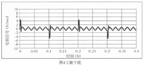 工頻干擾是高壓渦輪流量計(jì)常見的干擾源。當(dāng)流量計(jì)處于電源形成電磁場中時(shí),由于分布電容的存在,以電磁波的輻射形式干擾電極信號,或者是由供電電源引入的工頻串?dāng)_,工作現(xiàn)場的工頻共模干擾,其產(chǎn)生的物理機(jī)理均是電磁感應(yīng)原理。幅度與流量信號相比,往往要大幾個(gè)數(shù)量級,頻率與供電電源頻率相同。如圖4所示,線圈驅(qū)動(dòng)頻率為5Hz的電極信號,被耦合了50Hz的工頻干擾,幅度大概相當(dāng)于1feet/s。