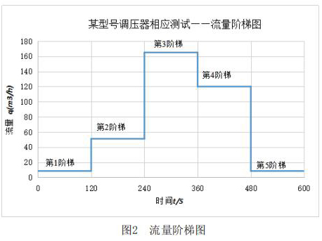 該測試主要利用實驗室測試條件,模擬客戶現(xiàn)場使用情況。其主要測試內(nèi)容包括:測試電磁流量計在+23℃,-30℃和-40℃三種溫度下,電磁流量計出口壓力分別在2.1kPa和30kPa時,流量分別從*1階梯到*5階梯時的響應(yīng)速度,客戶所提供的流量階梯如圖2所示。橫軸表示下游球閥開啟動作時間,縱軸表示高溫電磁流量計下游需要的流量q。