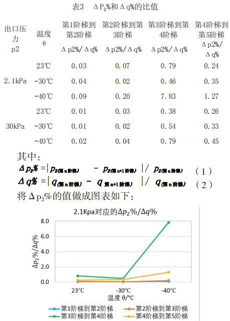 為了更直觀嚴(yán)謹(jǐn)?shù)膶Ρ让總€階段響應(yīng)速度的不同,對原始數(shù)據(jù)進(jìn)行處理,得到如下表格2和表格3。將△p2%/△q%作為響應(yīng)速度的直觀量化表達(dá),若△p2%/△q%的值大,說明單位流量變化照成的出口壓力變化大,即說明電磁流量計響應(yīng)相對較慢,反之亦然。