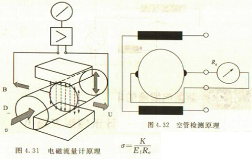 非滿管檢測(cè)也是基于電導(dǎo)率檢側(cè)的方法。在圖4.33所示的電磁流量傳感器中,增加了一個(gè)(或一對(duì))非滿管檢測(cè)電極。當(dāng)導(dǎo)管內(nèi)液體滿管時(shí),頂部電極與其他電極之間的電阻值很小;而當(dāng)存在非滿管情況時(shí),頂部電極與導(dǎo)電液體之間有氣體阻隔,所以電極電阻顯著增大,從而做出非滿管判斷。