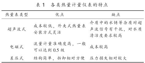 目前供熱行業(yè)內(nèi)使用的熱量計量儀表按工作原理主要分為超聲波式、 電磁式、 差壓式, 其特點見表 1 。 熱量計量儀表按結(jié)構(gòu)可分為一體式和分體式, 一體式熱量表將一支入口或出口溫度傳感器嵌入到流量傳感器管道中, 并配有專門的計算器進行熱量計算; 分體式熱量表采用單獨的流量傳感器, 包括超聲波流量計、 電磁流量計、 差壓流量計、流量計等, 溫度測量采用單獨的鉑電阻溫度計或溫度變送器測量供回水管道溫度, 再配備熱量積算儀進行溫度和流量信號采集得到熱量值。