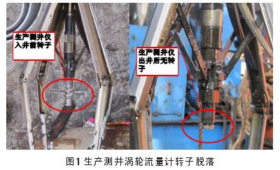 測(cè)井儀底部氣體渦輪流量計(jì)在四上四下測(cè)井任務(wù)中轉(zhuǎn)速過(guò)快,地面直讀顯示該轉(zhuǎn)子的*高轉(zhuǎn)速達(dá)到260rps,超過(guò)了轉(zhuǎn)子的安全工作轉(zhuǎn)速.上限200rps,同時(shí)需長(zhǎng)時(shí)間滯留在產(chǎn)層位置進(jìn)行流壓測(cè)試操作,因此直接原因?yàn)檗D(zhuǎn)子在高溫高流速的極限工作環(huán)境下發(fā)生脫落,影響了測(cè)井?dāng)?shù)據(jù)的錄取,如圖1所示。