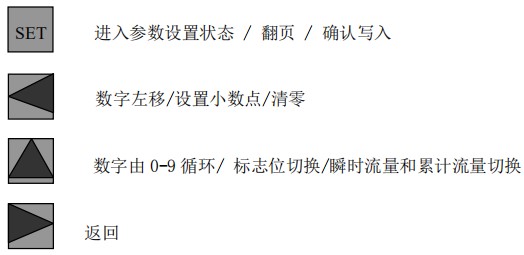 (3)標(biāo)況流量計算公式(若補償后單位為 U.0):(4)標(biāo)況流量計算公式(若補償后單位為 U.1):注:標(biāo)況指 20℃,1 標(biāo)準(zhǔn)大氣壓三、一體化液晶顯示表頭參數(shù)設(shè)置操作說明(V03Z)1、鍵盤按鍵說明2、 顯示窗字符說明注:表中 x 代表“0”或“1”;Zn:標(biāo)準(zhǔn)狀態(tài)下(20℃,1 標(biāo)準(zhǔn)大氣壓),被測氣體的壓縮系數(shù),Z:工作狀態(tài)下被測氣體的壓縮系數(shù)3、 操作說明3.1、本儀表表頭采用自導(dǎo)引式和菜單式相結(jié)合的參數(shù)設(shè)置方式,所謂自導(dǎo)引式參數(shù)設(shè)置方式就是用戶在進(jìn)入菜單 00 項后,表頭中的微電腦會自動導(dǎo)引用戶去設(shè)置需要設(shè)置的參數(shù)。另外,用戶也可以通過菜單模式分別對各組參數(shù)進(jìn)行設(shè)置。蒸汽測量菜單框圖如下:3.2、參數(shù)設(shè)置約定:在設(shè)置各項參數(shù)時,提示符閃動代表該項參數(shù)沒有設(shè)置完或者尚未確認(rèn),可以通過按SET 鍵來確認(rèn)或者按→鍵退出;提示符不閃動代表該項參數(shù)已設(shè)置完并確認(rèn),此時可以通過按 SET 鍵翻頁或者按→鍵退出。進(jìn)入?yún)?shù)設(shè)置時,需要輸入密碼(6 位)并確認(rèn)進(jìn)入,為了防止誤進(jìn)入?yún)?shù)設(shè)置菜單,保證儀表正常工作,在設(shè)置密碼時,使用↑鍵調(diào)數(shù)時不能循環(huán)調(diào)數(shù),只能單次調(diào)數(shù),只有密碼輸入正確進(jìn)入各項參數(shù)設(shè)置菜單后才可以對各位循環(huán)連續(xù)調(diào)整數(shù)據(jù)。3.3、儀表參數(shù)設(shè)置舉例:儀表出廠前各項參數(shù)已設(shè)置好,用戶無需設(shè)置。如果用戶需要設(shè)置某項參數(shù),請參照以下步驟,例如修改刻度流量值 QT:在工作狀態(tài)下,按 SET 鍵,顯示屏顯示 P,數(shù)字位為全零,8 秒鐘若無操作,自動返回工作狀態(tài)。輸入密碼 :按數(shù)字↑鍵和左移←鍵,輸入密碼數(shù) xxxxx(出廠時默認(rèn)密碼為 000123),↑鍵調(diào)各位數(shù)字 0-9,每按 ←鍵一次數(shù)字向右循環(huán)一位,可通過多次按←鍵對整段數(shù)字清零,按→鍵可以返回工作狀態(tài)。菜單選擇項:按 SET 鍵確認(rèn),顯示屏顯示如右圖所示,末行“00”閃動調(diào)整該項值選擇不同參數(shù)設(shè)置菜單。該例直接按 SET 鍵進(jìn)入菜單 00 項設(shè)置刻度流量:QT 閃動,*一步:*先進(jìn)行小數(shù)點調(diào)整,可以通過←鍵對參數(shù)快速清零或者通過↑鍵進(jìn)行小數(shù)點調(diào)整,調(diào)整完畢,按 SET 鍵確認(rèn)(QT 仍閃動);*二步:數(shù)值調(diào)整,可以通過↑鍵對每位數(shù)字進(jìn)行調(diào)整,按 ←鍵一次數(shù)字向右移動一位,調(diào)整完畢,按 SET 鍵確認(rèn),QT 停止閃動,該項參數(shù)設(shè)置完畢,可進(jìn)行下一項參數(shù)設(shè)置或者退出另外,單位設(shè)置 U.X 和補償方式設(shè)置 dX 通過↑鍵調(diào)整修改。3.4、校驗項說明: 儀表出廠前,溫度和壓力通道已校驗設(shè)置好,無需用戶重新校驗。校驗通道有密碼保護(hù),廠家不對外開放,如果需要重新校驗溫度或者壓力通道,請專業(yè)人員與廠家技術(shù)人員聯(lián)系。4、計算公式說明4.1、蒸汽測量計算公式(1)渦街流量儀表工況體積流量計算公式:(2)密度 d,單位 Kg/m3(3)質(zhì)量流量計算公式,單位 Kg/h:(4)質(zhì)量流量計算公式,單位 t/h:4.2、氣體測量計算公式----標(biāo)況指 20℃,1 標(biāo)準(zhǔn)大氣壓(1)渦街流量儀表工況體積流量計算公式:(2)對比壓縮系數(shù) d(Zn/Z),單位 1(3)標(biāo)況流量計算公式,單位 Nm3/h:P1—工況絕壓,PN—標(biāo)況絕壓(Mpa),T1—工況熱力學(xué)溫度,TN—標(biāo)況熱力學(xué)溫度(K)