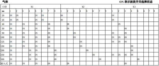 以上表值僅供參考,實際使用中因液體粘度和氣體密度不同應在此值附近調(diào)整,頻率低時可將 K3 向大口徑方向調(diào)一至三檔。頻率高時可將 K2 向小口徑方向調(diào)一至三檔。