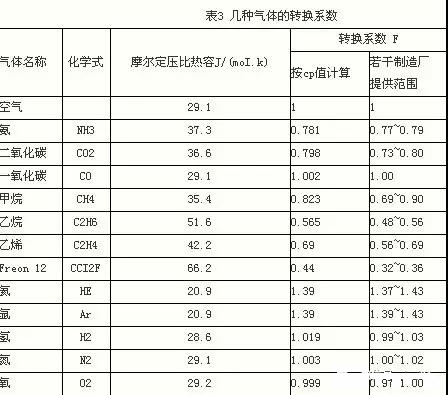 2) 不同氣體間流量換算 有些制造廠的使用說明書給出以空氣為基數(shù)的轉(zhuǎn)換系數(shù)f,可按式6換算;也可直接以標(biāo)定(校準(zhǔn))氣體和實(shí)際使用氣體的摩爾定壓比熱按式6換算,但因還有熱導(dǎo)率等其他因素,換算后精度要降低些。表3給出若干氣體按摩爾定壓比熱容直接計(jì)算和若干制造廠提供的兩種轉(zhuǎn)換系數(shù)數(shù)據(jù),其中freon12兩者差別較大。