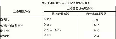 2) 浸入式 帶測量管的浸入式流量傳感器和插入式儀表需要一定長度前置直管段,iso/dis 14511對此未作具體規(guī)定,而按制造廠建議的值。bs 7405建議對于在管道中用插入熱絲流速計(jì)時(shí),需要(8~10)d的上游直管段和(3~5)d的下游直管段。表4列舉sierra公司對帶測量管浸入式tmf所規(guī)定的上直管段長度;若在其進(jìn)口端裝一塊或二快多孔板式流動(dòng)調(diào)整器(整流器)后,則其長度可大為縮短,如表*右列所示。