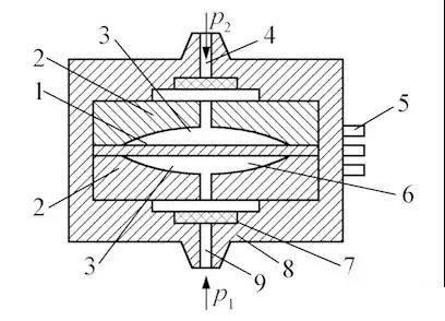 1—金屬膜片(動(dòng)極);2—凹玻璃圓盤;3—金屬鍍層(定極);4—低壓側(cè)導(dǎo)壓口;5—輸出端子;6—空腔;7—過濾器;8—殼體;9—高壓側(cè)導(dǎo)壓口