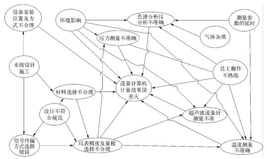 制藥廠污水流量計量系統(tǒng)計量的準確性既與制藥廠污水流量計本體有關(guān),也和壓力、溫度測量儀表、色譜分析儀以及流量計算機等設(shè)備的可靠性有直接關(guān)系。此外,在員工操作、環(huán)境影響、設(shè)計選型、設(shè)備安裝等方面也會一定程度影響制藥廠污水流量計量的準確性,其影響因素復(fù)雜多樣。電磁計量系統(tǒng)計量準確性影響因素關(guān)聯(lián)關(guān)系如圖2所示。在實際生產(chǎn)應(yīng)用中,對制藥廠污水流量計量準確性造成較大影響的主要是噪音、液體計量雜質(zhì)、氣體組分分析以及壓力、溫度測量這四個方面。