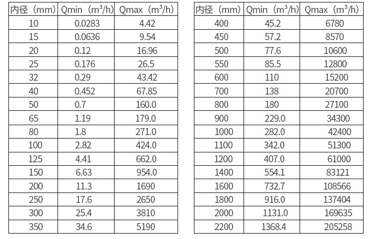 您可以根據(jù)自身工藝管道的實(shí)際流量對(duì)應(yīng)上表中的流量來選擇相應(yīng)口徑規(guī)格的流量計(jì),盡可能選擇與工藝管道相同口徑規(guī)格的流量計(jì)。