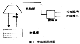 常見(jiàn)的液位傳感器有磁浮筒式、壓力式等,磁浮筒式傳感器要安裝在被測(cè)介質(zhì)中,長(zhǎng)時(shí)間使用易被腐蝕,而壓力傳感器輸出線性較差且成本較高。超聲波傳感器的特點(diǎn)是使用時(shí)與液面脫離接觸,無(wú)腐蝕問(wèn)題,且價(jià)格低廉。超聲波傳感器由控制卡及換能器構(gòu)成,如圖I。
