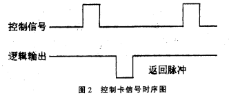其外部特性如圖2所示。其工作原理是,每當(dāng)在“控制信號(hào)”端加一正脈沖(寬度0.2ms),控制卡便通過(guò)換能器發(fā)一束超聲波,當(dāng)超聲波遇被測(cè)污水反射后又被換能器接收,控制卡便通過(guò)“邏輯輸出”端輸出一“返回脈沖”。通過(guò)計(jì)量“控制信號(hào)”到“返回脈沖”之間的時(shí)間T便可按下式計(jì)算出換能器距被測(cè)污水表面的距離H,由于安裝時(shí)換能器固定在污水的上方(高度不變),因此,換能器距污水底部的距離HO(其值已知)減去H即為污水液位H1。