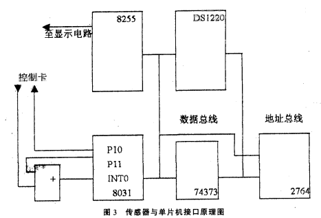 圖3中,單片機(jī)8031、74373和2764組成單片機(jī)核心電路,8255為顯示電路接口,DSl220為不揮發(fā)RAM,用其存儲(chǔ)流量可保證斷電后流量不丟失。工作時(shí)8031每隔一個(gè)采樣周期先啟動(dòng)定時(shí)器T1,然后通過(guò)PIO引腳向控制卡發(fā)控制信號(hào),換能器發(fā)一聲波經(jīng)被測(cè)污水反射由換能器接收,控制卡的邏輯輸出端輸出一脈沖,脈沖信號(hào)經(jīng)過(guò)或門進(jìn)入INTO腳,引起中斷請(qǐng)求。在中斷服務(wù)程序中從定時(shí)器中取出定時(shí)值,計(jì)算出對(duì)應(yīng)的液位。由于傳感器在發(fā)出聲波后,在4MS以內(nèi)會(huì)產(chǎn)生無(wú)用的盲區(qū)脈沖,所以在P10向控制卡發(fā)控制脈沖的同時(shí),通過(guò)P11引腳發(fā)一個(gè)4ms的高電平封鎖信號(hào),防止“盲區(qū)脈沖”通過(guò)或門進(jìn)入INTO引腳。